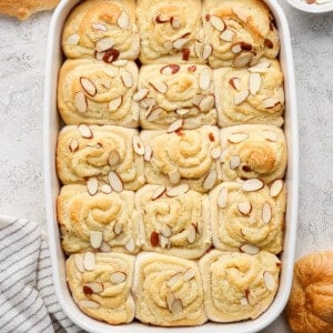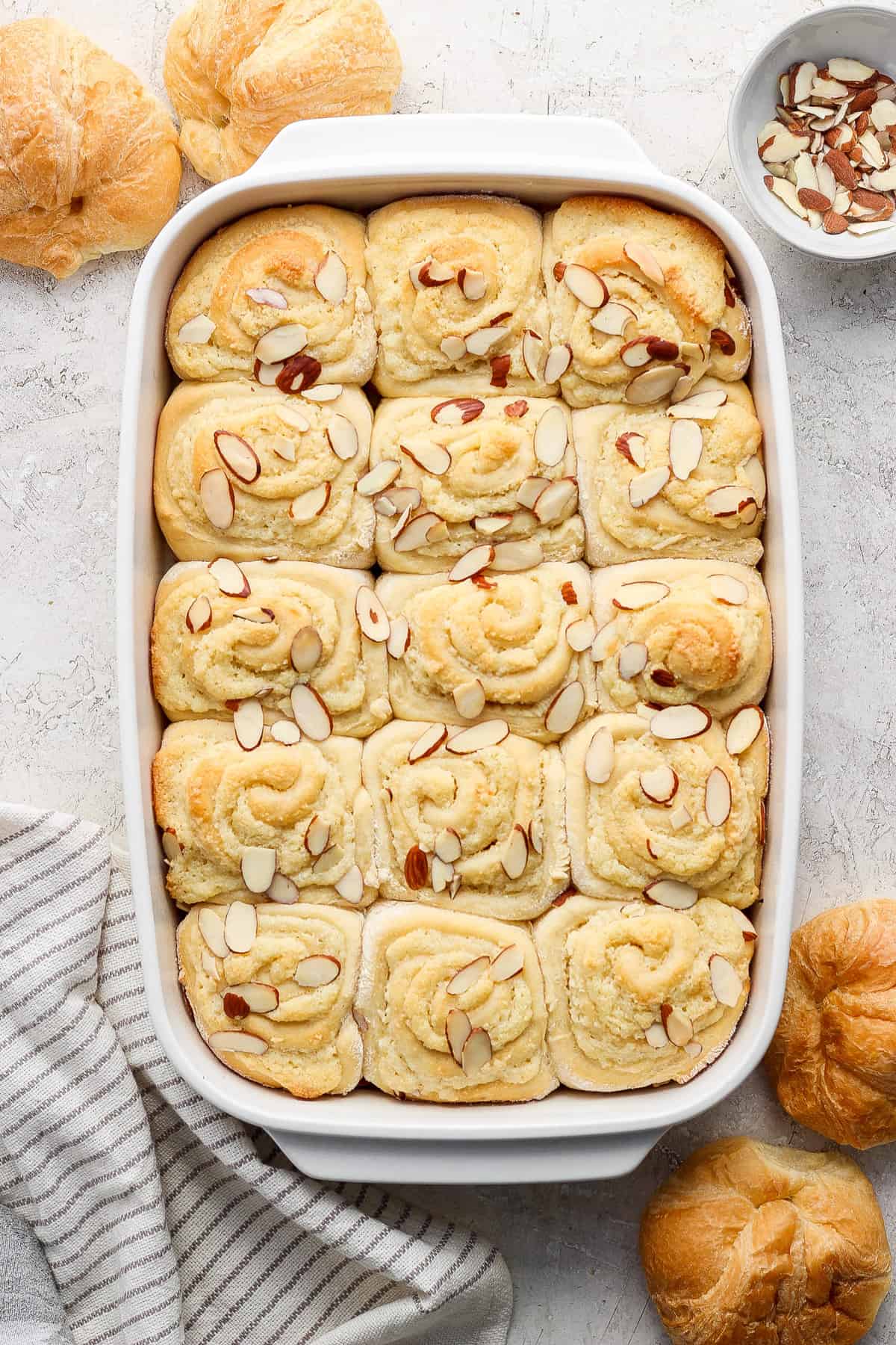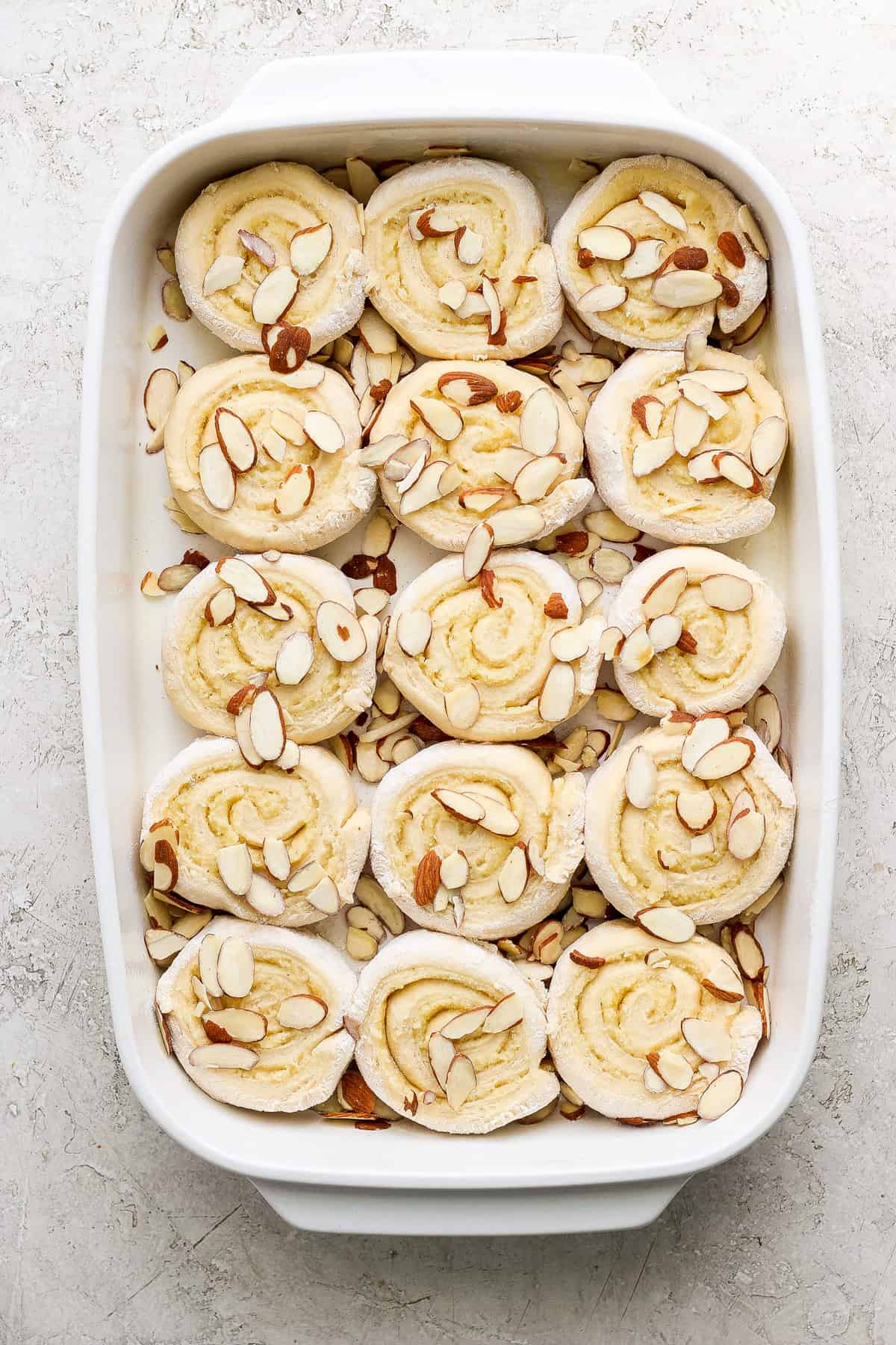 - Butter a 9×13 baking dish or line it with parchment paper. Add the rolls to the dish, making sure they just barely touch. Sprinkle the almond slices over the rolls.