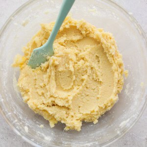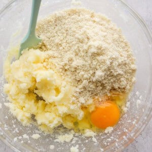 - Then, add the almond extract, almond flour, and egg to the creamed butter and sugar and mix to combine. Refrigerate for 15 minutes.