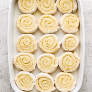 Use a SHARP serrated knife and gently slice your cinnamon rolls using a gentle back and forth motion, making sure to not squish the rolls. This will help keep the form, but don’t you worry if the rolls squish a bit — you can reform the rolls easily with your hands.
