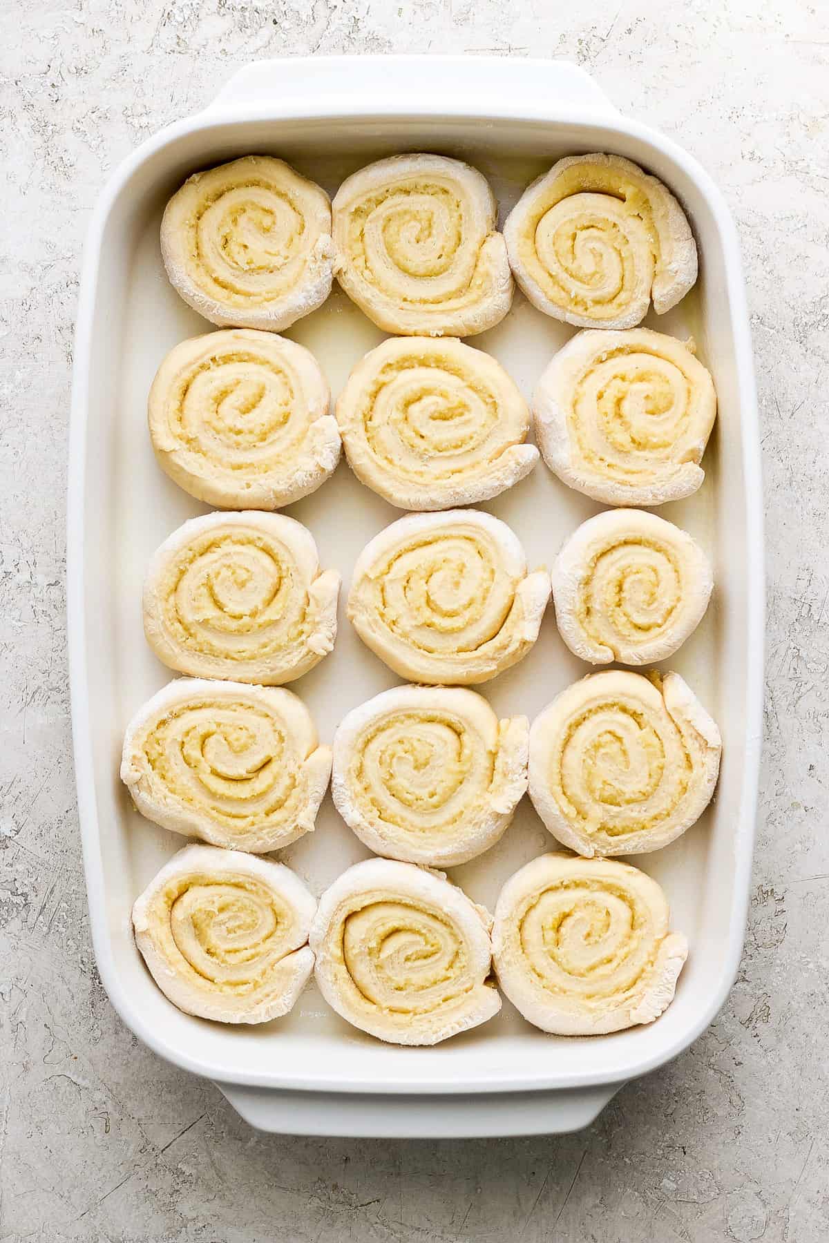 - If you aren’t making the rolls in advance, cover with plastic wrap and then a tea towel, and place them in a warm spot to rise until the rolls begin to touch – about 30 minutes. While the rolls rise, preheat your oven to 350℉.