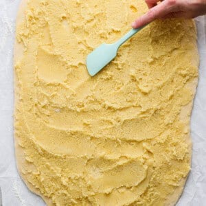 - Spread the filling over the dough and then roll it into a tight log, starting at one of the long sides.