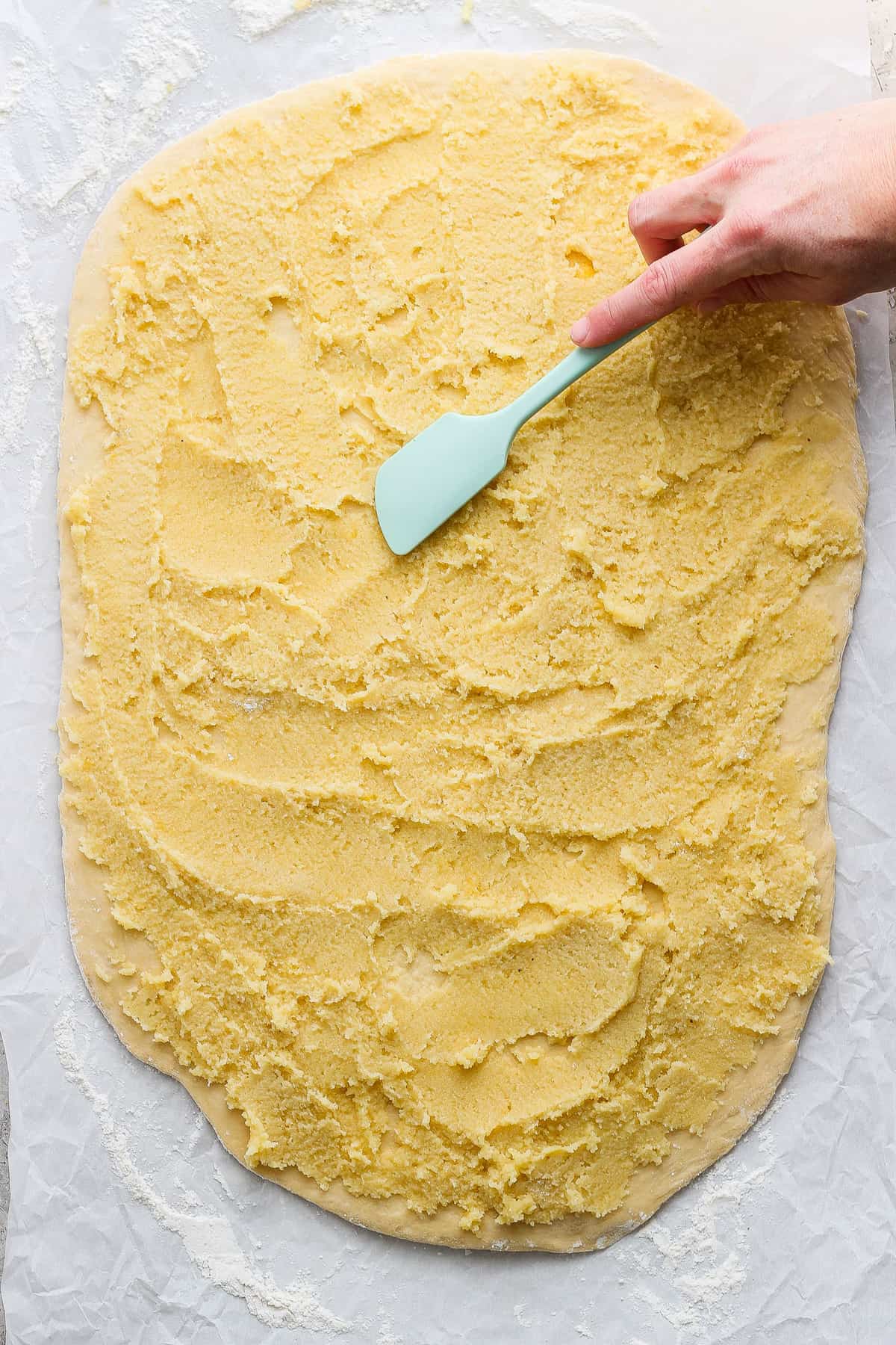 - We like to refrigerate the frangipane before spreading it on the dough so that it doesn’t squish out while cutting the rolls. You will still lose some while cutting, but not nearly as much.
