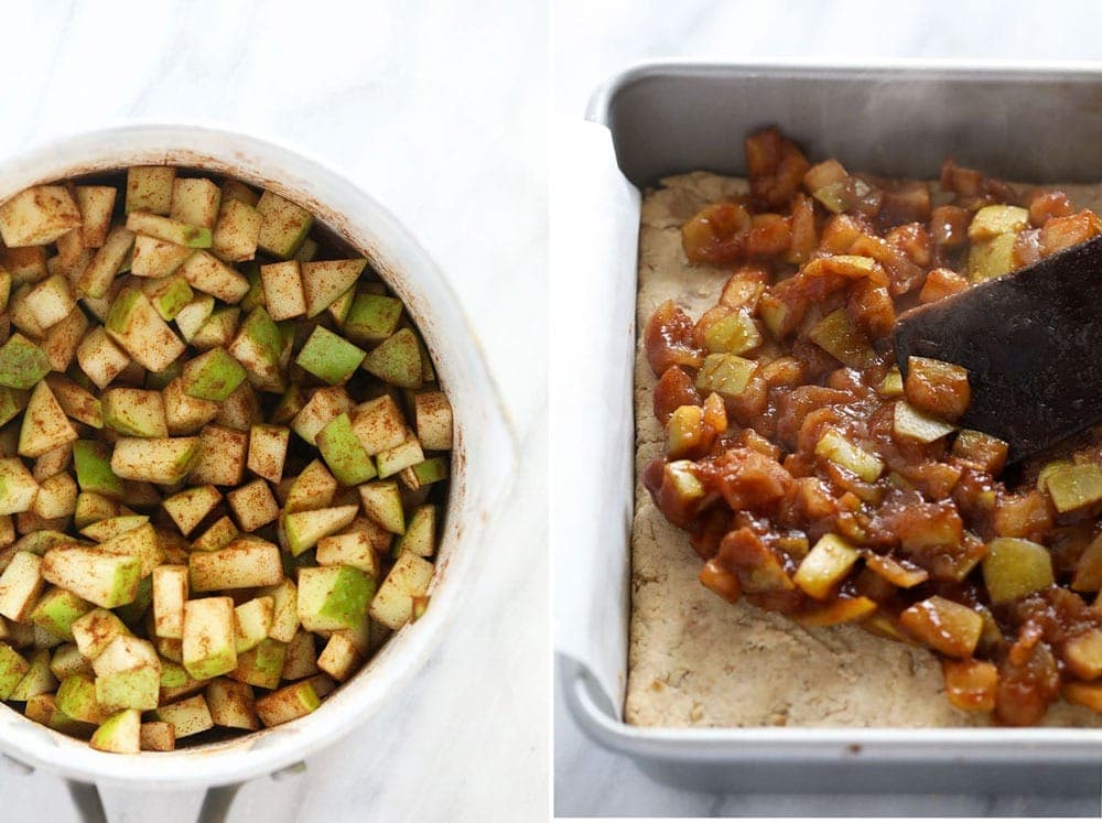 - Pour the apple filling over the baked crust. Use a spatula to evenly spread it out. Set aside.