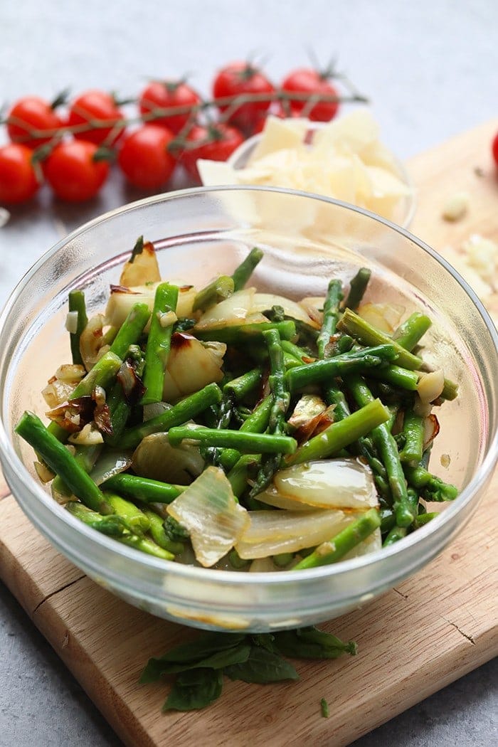 - When olive oil is fragrant add onion and saute for 2-3 minutes. Then add in asparagus, tomatoes and garlic. Saute veggies until onion is translucent and asparagus is cooked, but not mushy. About 4-5 minutes. Remove from heat and transfer vegetables in to a separate bowl.