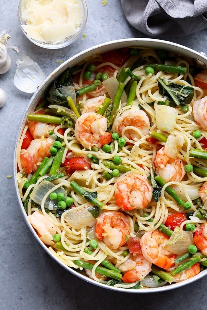 - Remove from heat and toss the pasta and peas with the vegetables and shrimp. Add lemon zest, fresh basil, parmesan cheese, and salt and pepper (if needed).