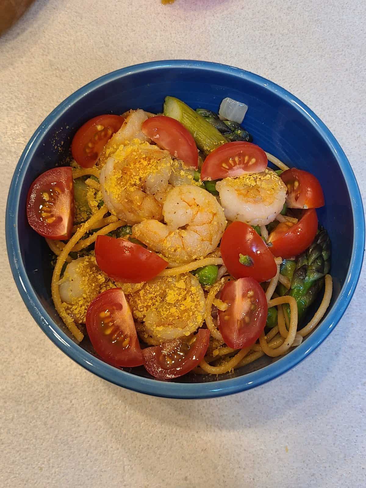 Added the lemon in with the shrimp. Very easy and quick too! Next time I will boil the water first, then prep everything else so that everything is ready at the same time. I used chickpea pasta (Banza) and it was great! Next time I’ll use more lemon and garlic though. And cook the tomatoes with the asparagus.
