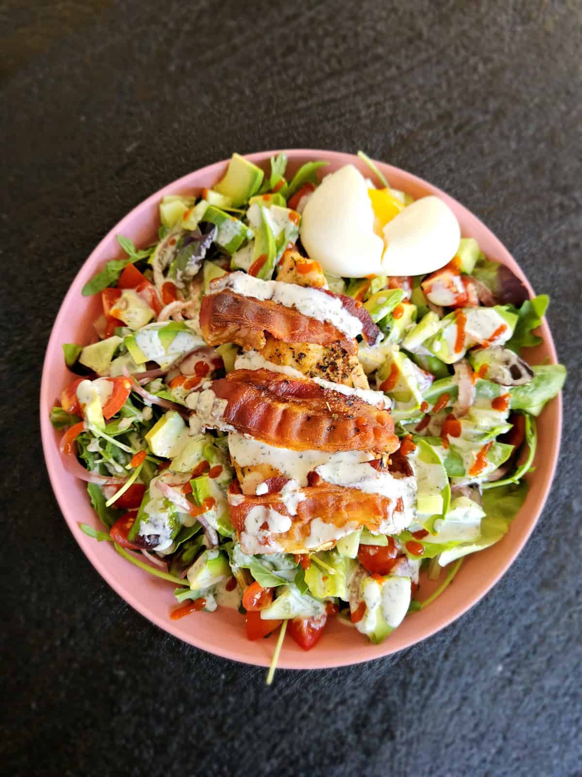 I always need to add proteins and fats to my salad to keep it satisfying. I don’t know how people can just eat lettuce and maybe some veggies and say it keeps them full for hours. No way. I’d be hungry wayyy too soon. Bacon wrapped chicken would be a new protein topping for sure though. Had them separately on a salad, but not together lol.