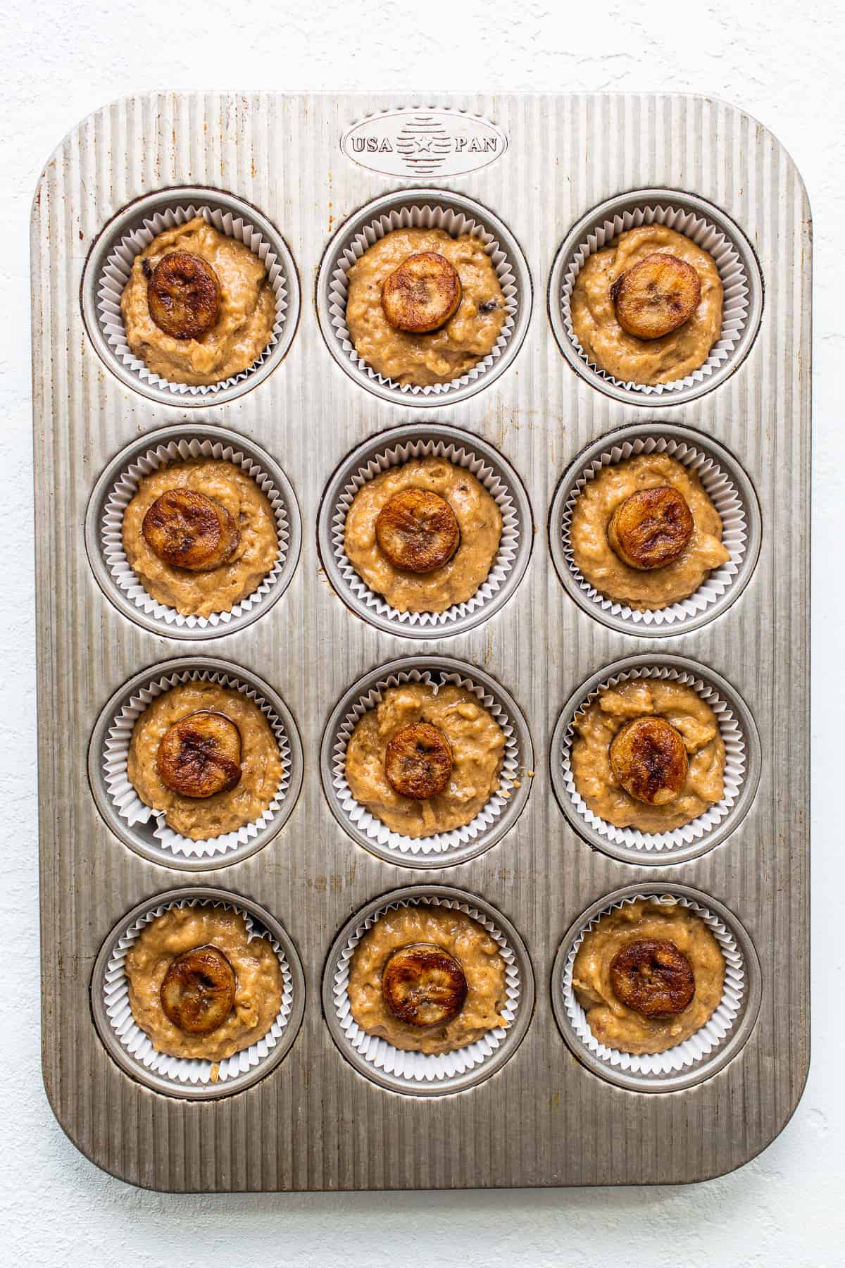 - Once the muffin batter is combined, scoop the batter into the lined muffin cups — filling them about ¾ of the way full. Place one of the caramelized slices of bananas on top of each muffin. Be sure to gently press the bananas into the batter.