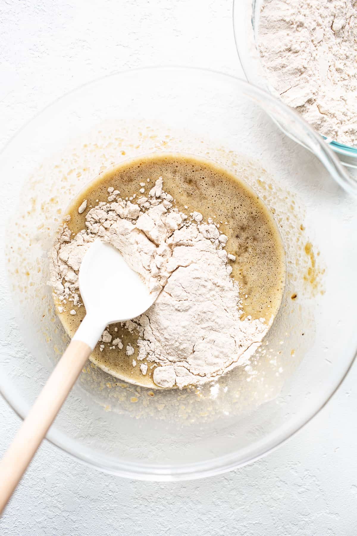 - Slowly add the dry ingredients to the wet ingredients, mix to combine, and then add the melted coconut oil and mix again.