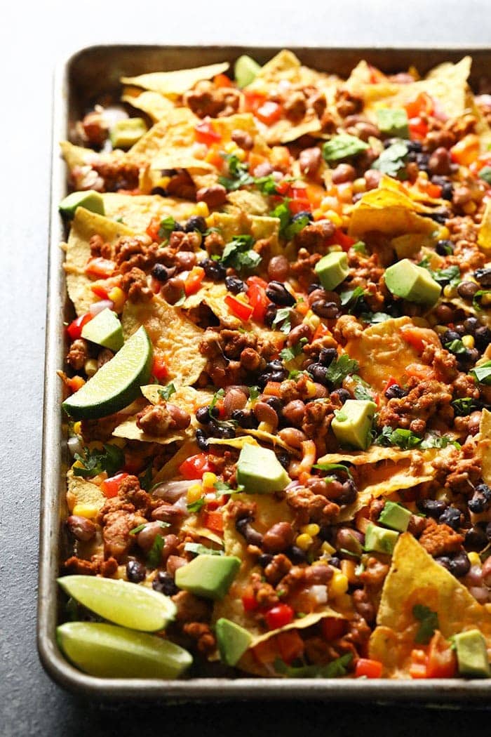 Nachos are a go-to recipe on game day for many people! The beauty is that you can bake everything on a baking sheet, bake it, and serve the nachos right on the baking sheet! It’s the perfect vehicle.