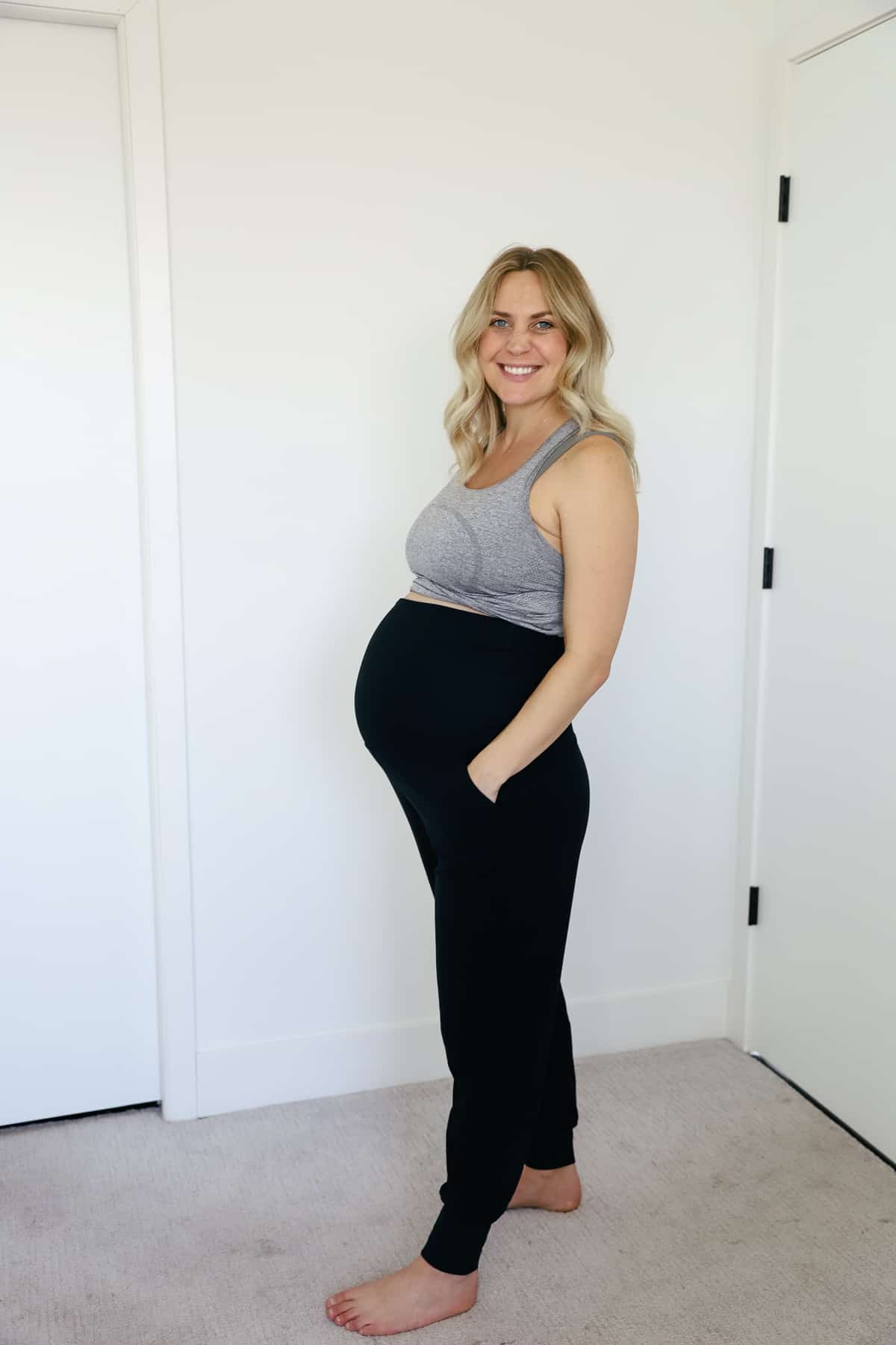 The Align Joggers come in a variety of different fits, but the one that is best for pregnancy is by far the Align Sper High-Rise Ribbed Waist Jogger. It folds down so it can easily sit below the belly, or you can unfold it and it can hug the belly like a belly band. It’s truly life-changing! Lee is wearing her normal size – 8.