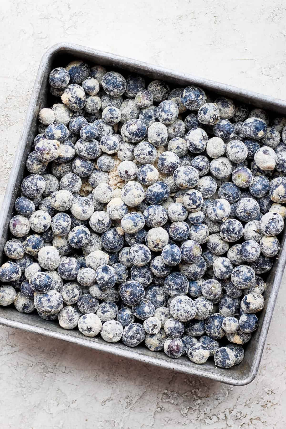 - Layer the ingredients. Pour the blueberries in a greased 9×9 baking dish. Sprinkle the topping over the blueberry filling.
