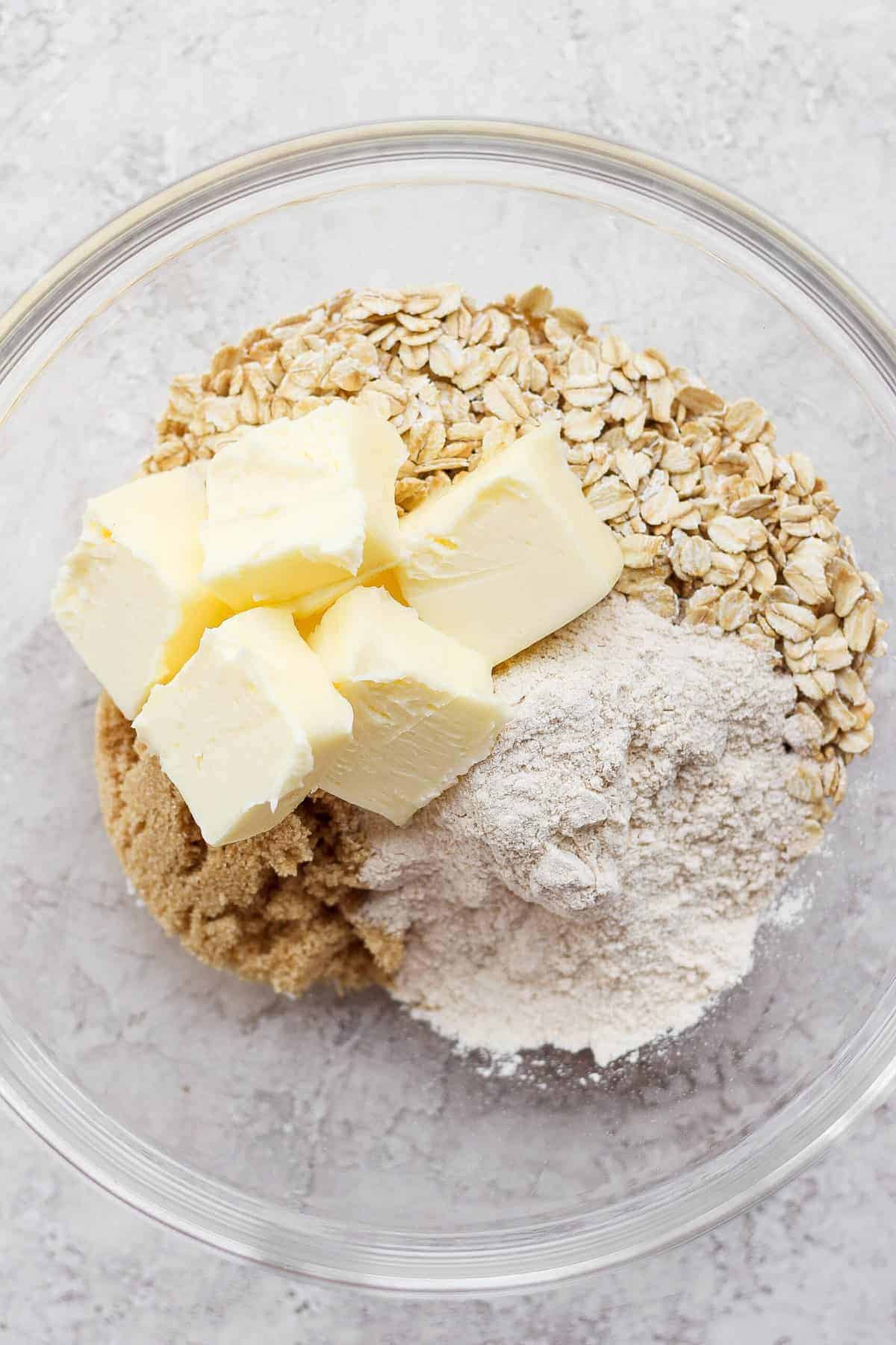 - Butter– the butter acts as a both a binder for the topping and creates the perfect golden brown color.