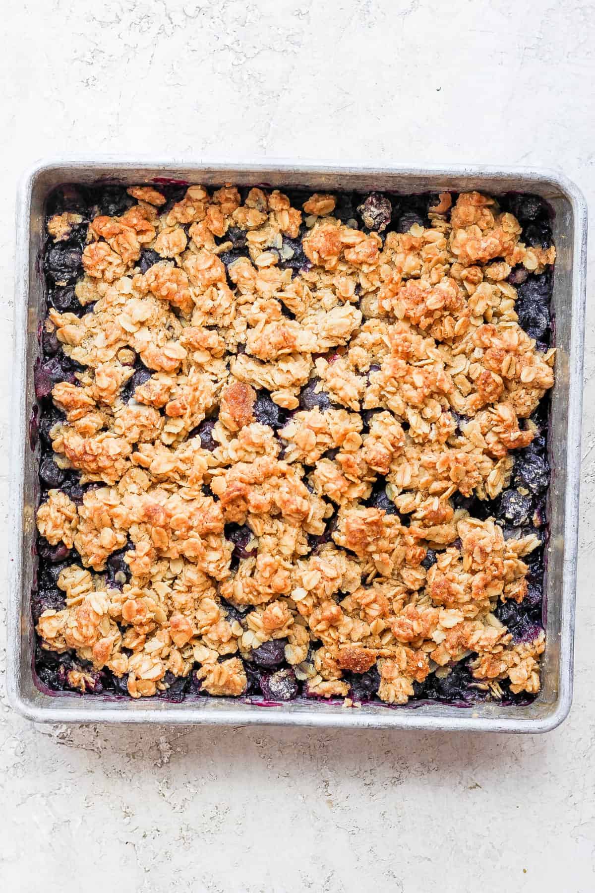 - Bake. Place the blueberry crisp in the oven and bake at 375ºF and bake for 30 minutes, cover with tin foil, and bake for an additional 15 minutes.