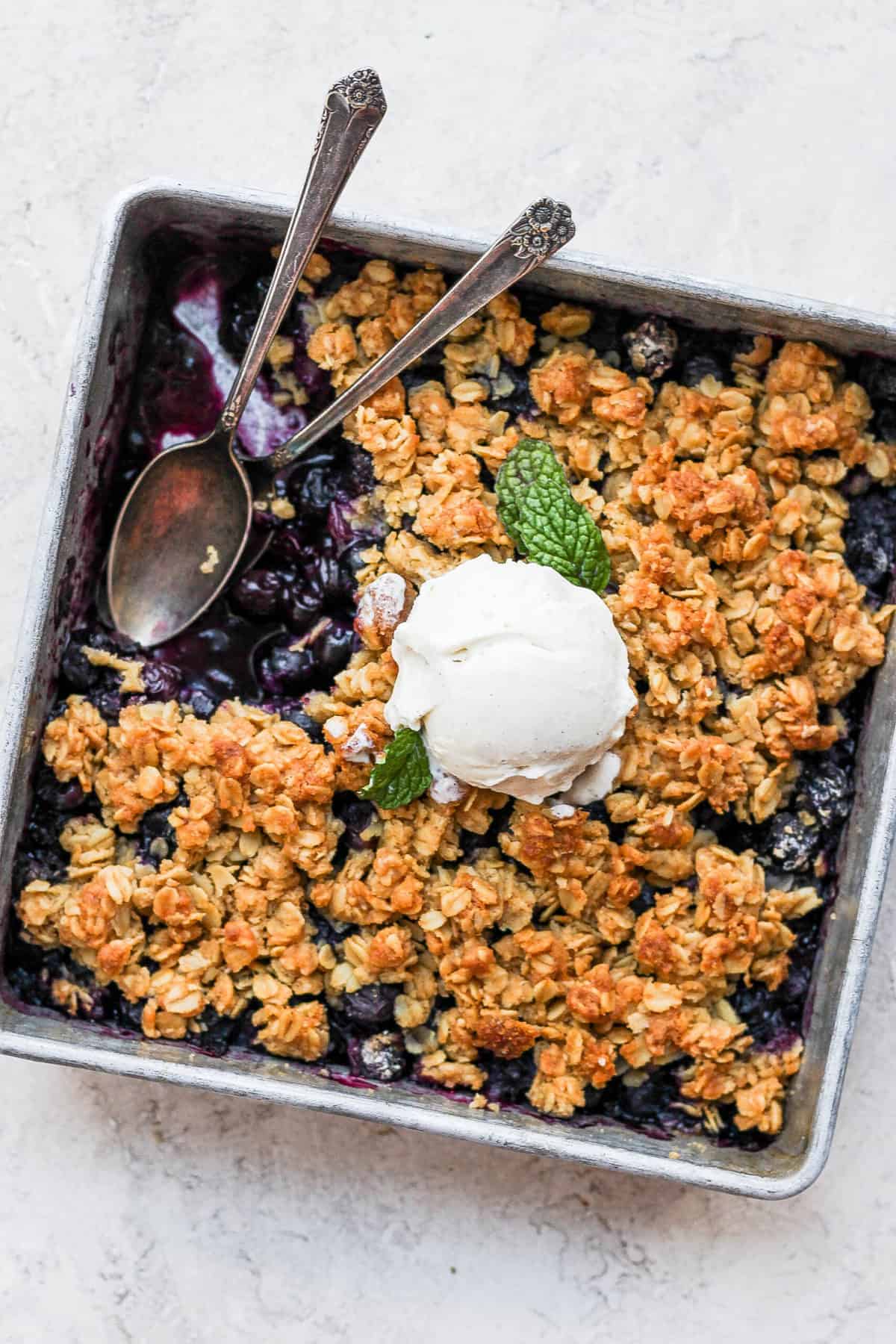 This easy blueberry crisp is made with simple ingredients like blueberries, lemon juice, and flour and is topped with a golden crumble on top. It is the perfect healthy summer dessert and we love eating it a la mode!
