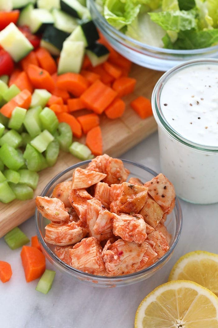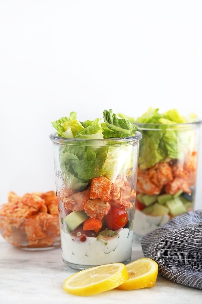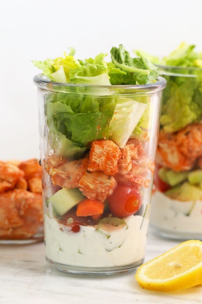 We love mason jar salads! Not only are they great for meal prep and lunches on the go, they’re also oh so pretty. In addition to this buffalo chicken salad recipe, we’ve got a delicious Spring Cobb Salad with Raspberry Basil Vinaigrette and this Tex Mex Quinoa and Creamy Cilantro Lime Dressing Salad to choose from. By simply pouring the dressing as the bottom layer in your mason jar and keeping your lettuce of choice as the top layer, this buffalo chicken mason jar salad will keep in the fridge for 3-5 days. So, feel free to double or triple this recipe if you’re meal prepping lunches for the whole fam for the week. This buffalo chicken mason jar salad packs some nutritious veggies, including:- Tomatos