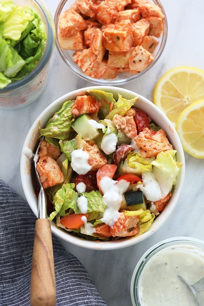 With just a few basic ingredients you can whip up the most delicious Greek yogurt blue cheese salad dressing for this buffalo chicken mason jar salad. That’s right, this is a Greek yogurt-based salad dressing, so we’re ditching the mayo and sour cream for a dairy that’s packed with protein. Don’t worry, you’re still going to get that tanginess from the apple cider vinegar and lemon juice. Here’s what you need:- Plain Greek yogurt