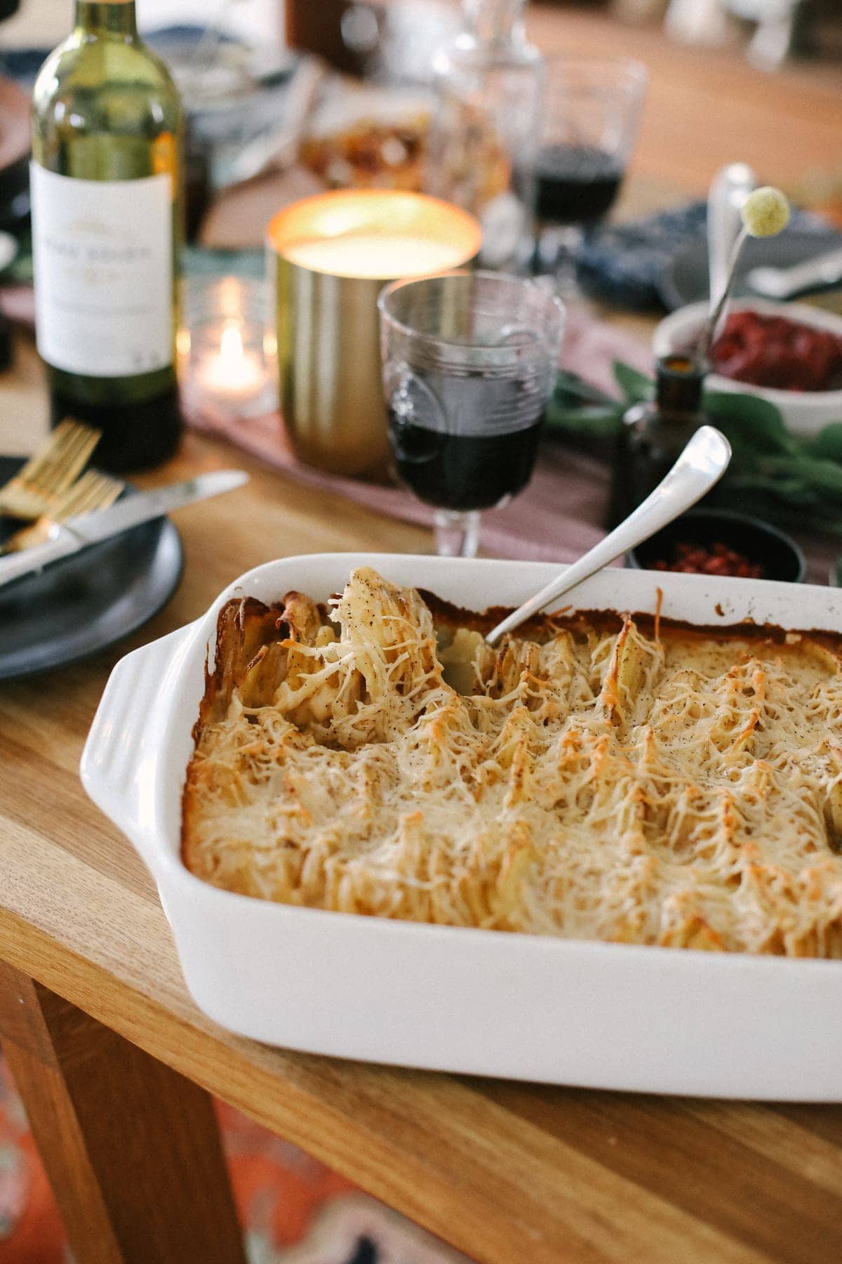 - Use the sliced potatoes to create 3 rows of tightly packed potatoes on top of the cheese sauce in the dish.