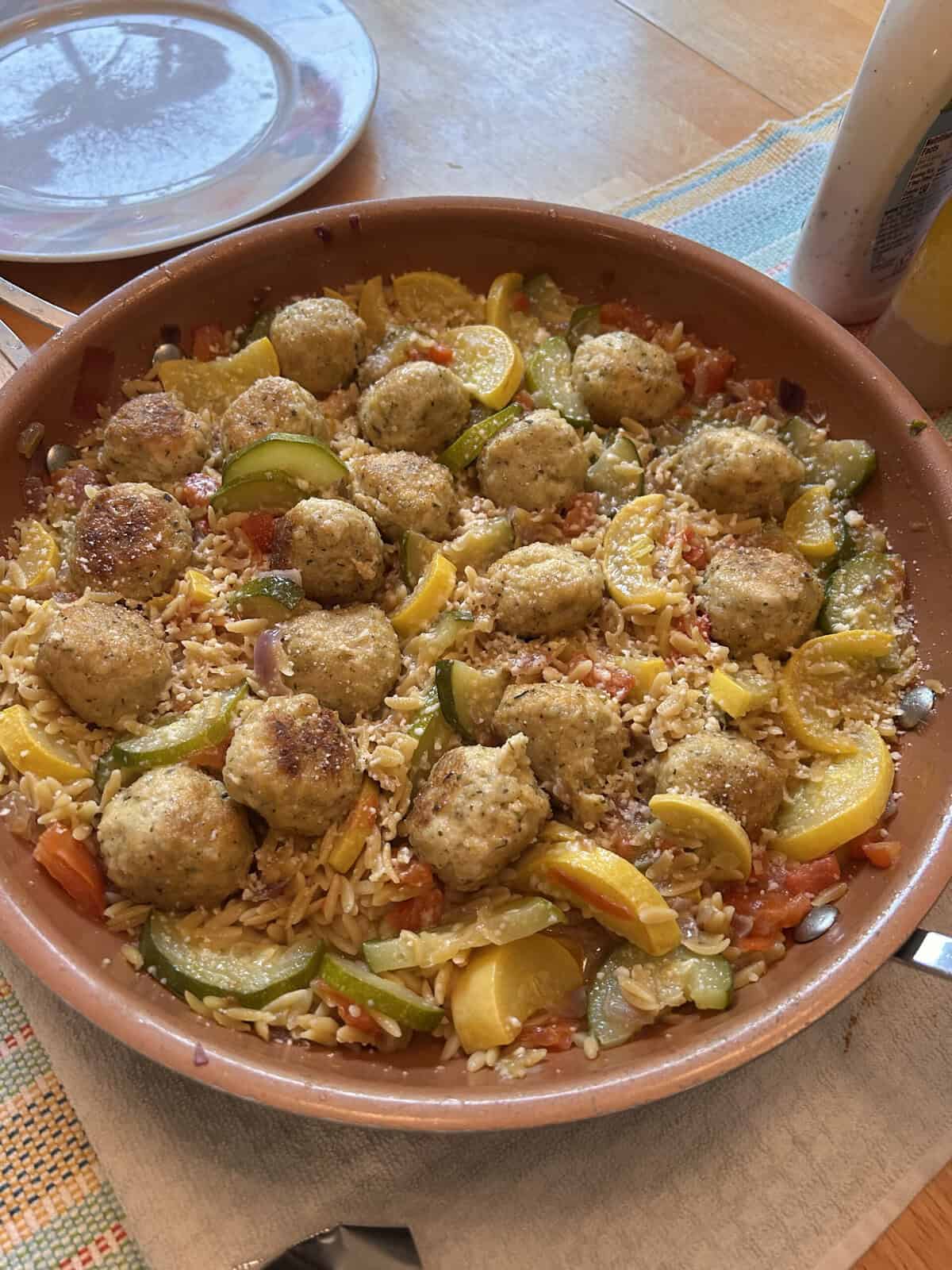 Summer Squash Orzo Skillet with Chicken Meatballs