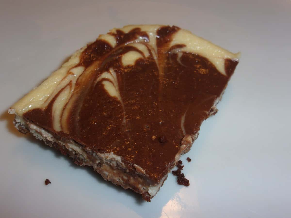 - Create a checkerboard with the darker cheesecake mixture and use a toothpick to swirl the colors together.