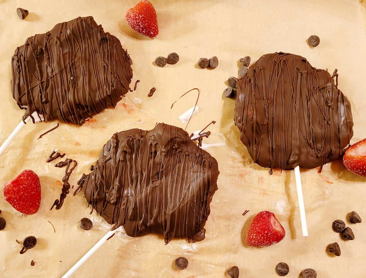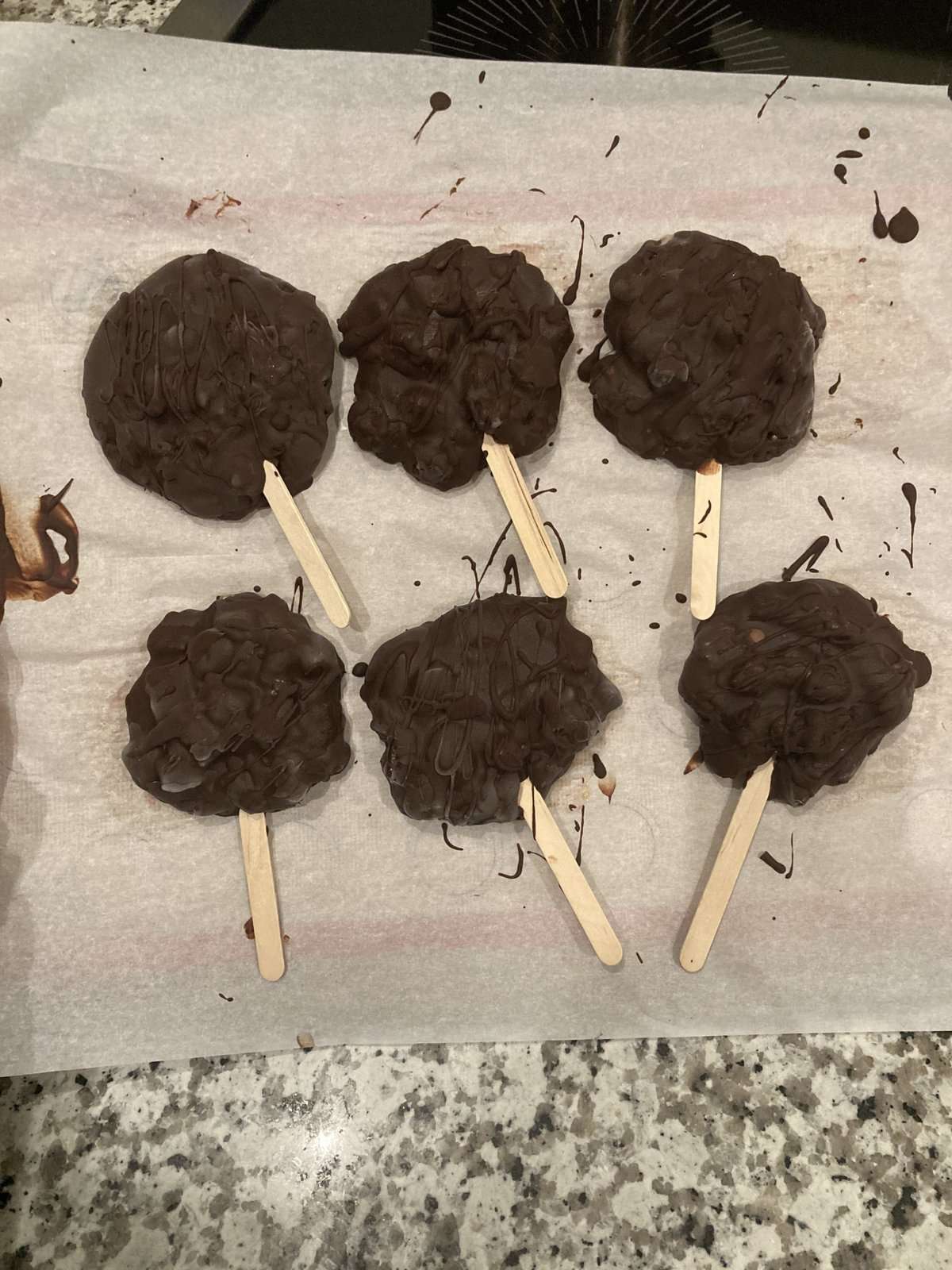 - Gently spread each cluster out into a circle and place a popsicle stick into each cluster. Transfer the baking sheet to the freezer for at least 2 hours.