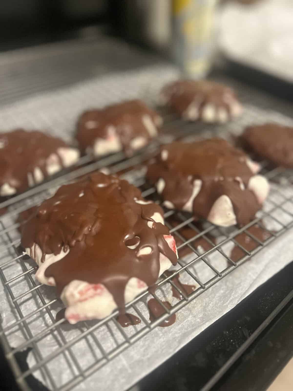 - Remove the clusters from the freezer and quickly spoon the melted chocolate ontop of each cluster, completely covering both sides (like a Dilly Bar!) and place them back onto the lined baking sheet. Repeat until each cluster is covered.