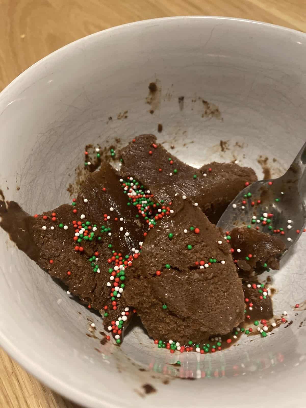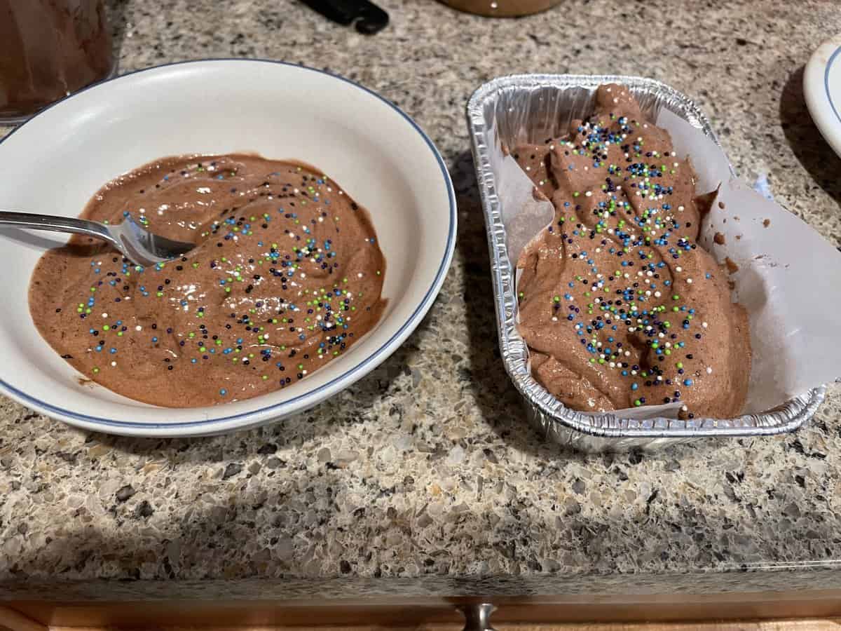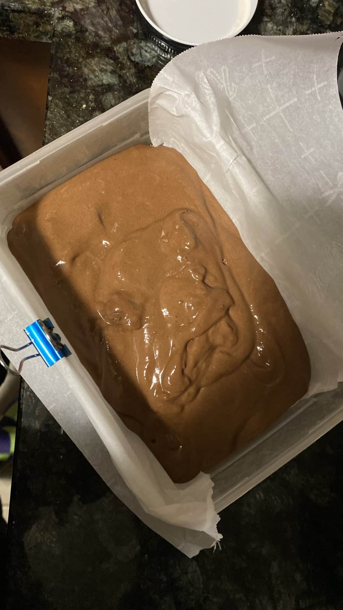 - Ice Cream: If ice cream is more of your jam, line a loaf pan with parchment paper and pour the chocolate protein ice cream in the pan. Evenly spread the ice cream out and cover with plastic wrap. Place it in the freezer for at least 2 hours.