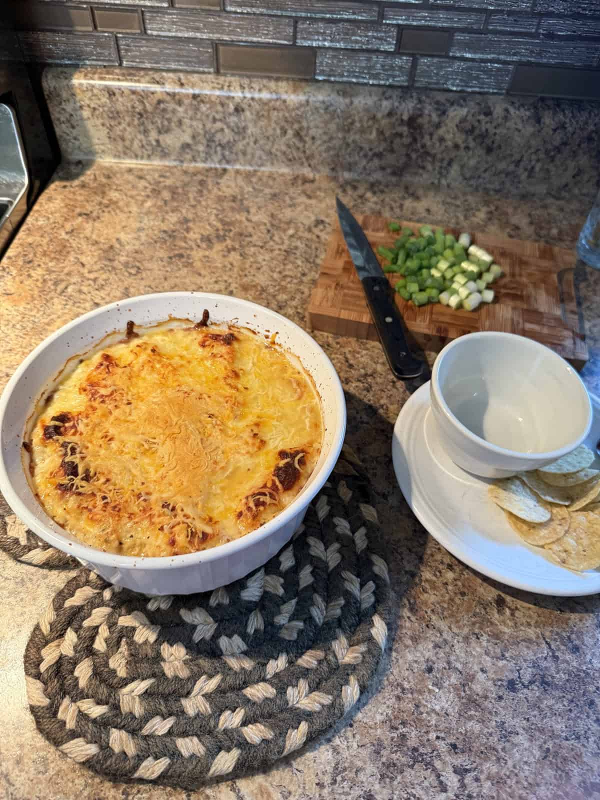 - Once the dip is hot, remove it from the oven. Sprinkle on blue cheese and diced green onion.