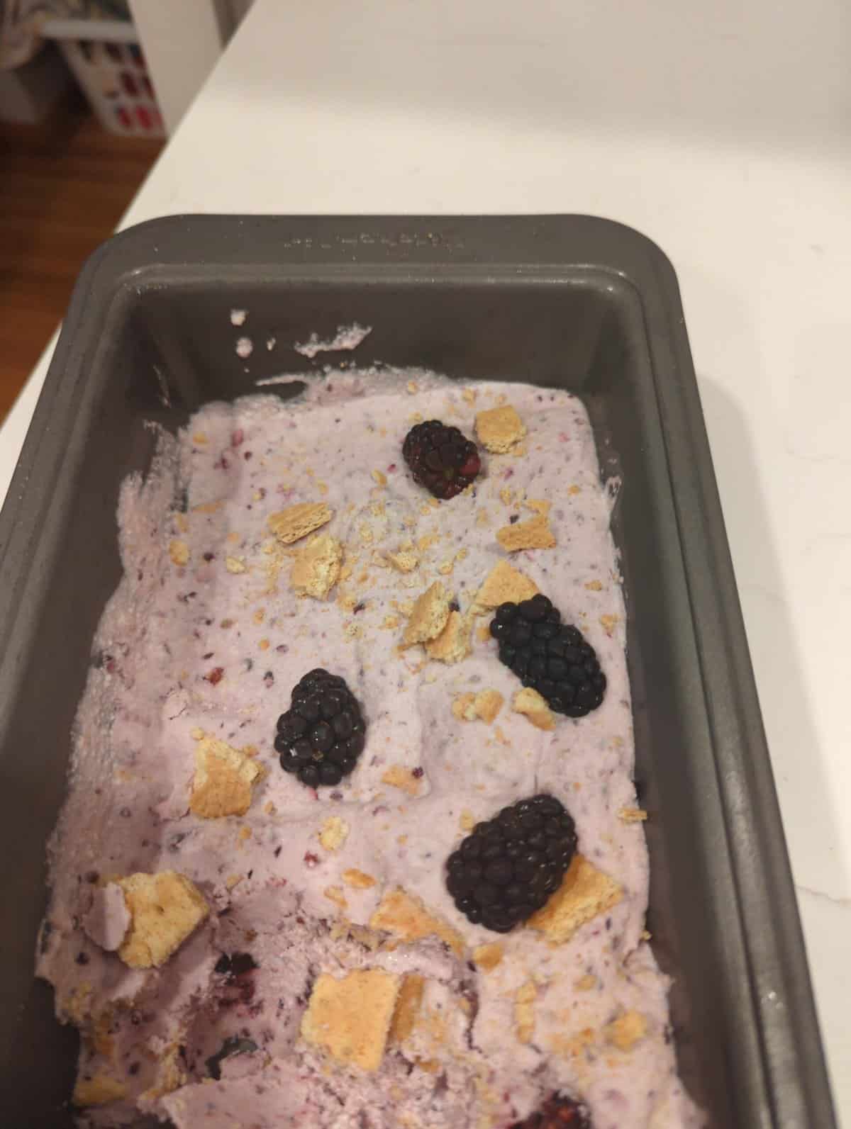 - Freeze: transfer the ice cream into a bread pan and then sprinkle on the remaining berries. Crush a few graham crackers on top and cover. Freeze for at least 4-6 hours or over night.