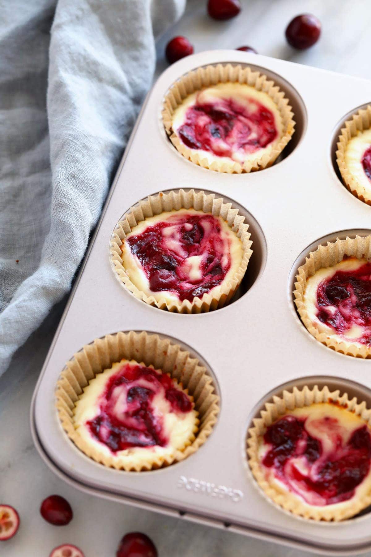 Swirl: If you don’t have time to make cranberry sauce (our lemon ginger cranberry sauce tastes amazing in these mini cheesecakes!), use your favorite store-bought version or any kind of jam (raspberry, strawberry, blueberry, or cherry would be delicious). You could also try swirling in apple butter for a fall twist on these cheesecake bites.