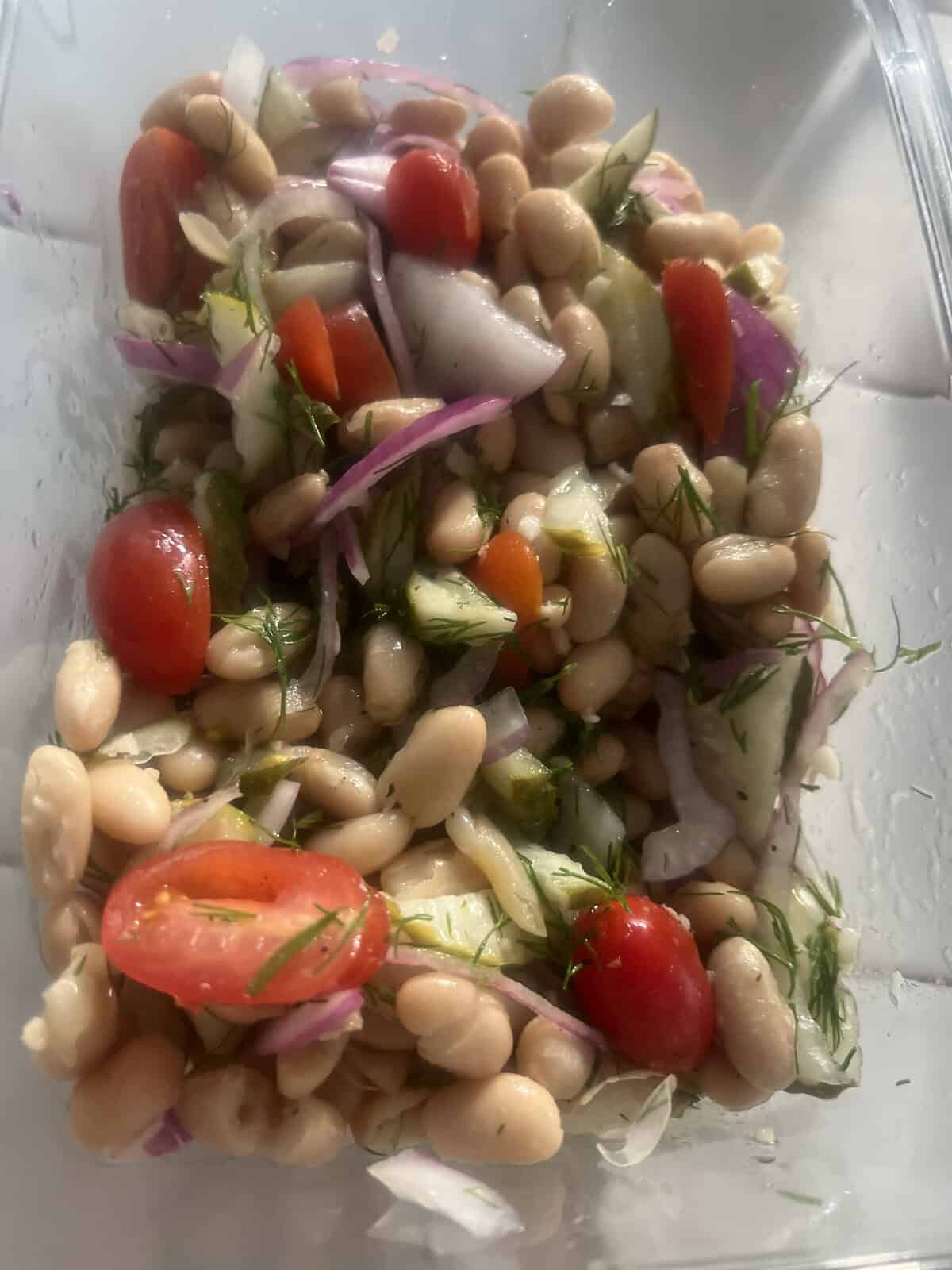 - Add the red onion, cherry tomatoes, dill pickles, and fresh dill to the beans. Toss to combine.