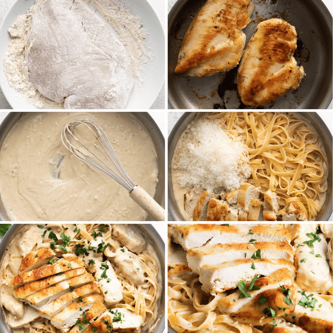 This easy chicken Alfredo recipe is a 2 part recipe – 1. chicken and 2. Alfredo sauce. Here’s a quick run-down of how to make it.