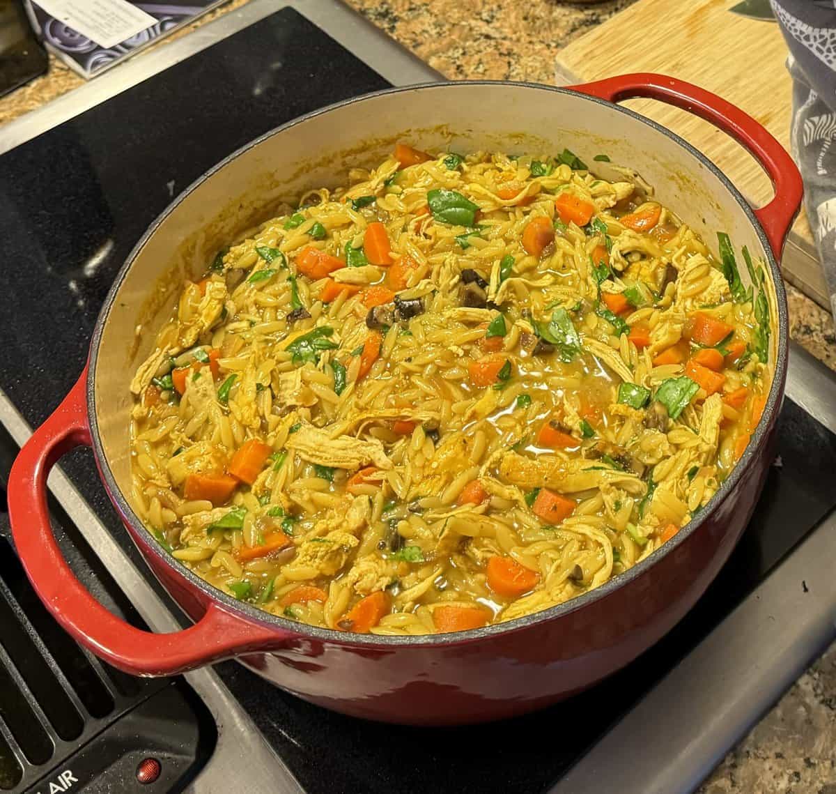 - Add the orzo, stir, and turn the heat to medium heat. Allow the orzo to cook and thicken the soup for 7-10 minutes or until the orzo is al dente. Remove from heat.