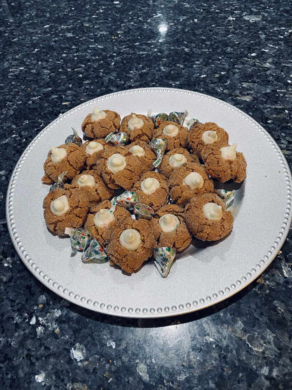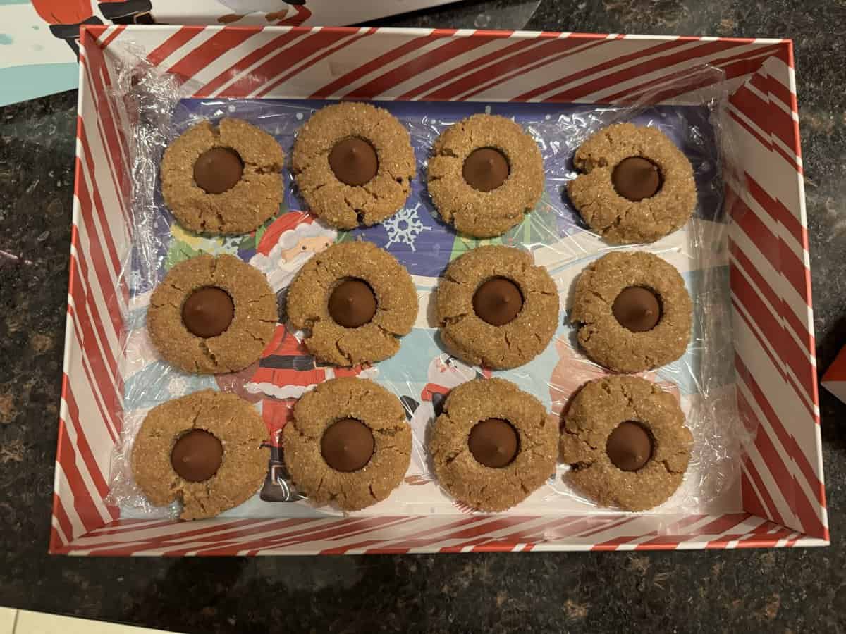 MY MIL had given me this PB cookie recipe ages ago. I hadnโt made them in forever. Loved them then; love them now! Super simple recipe. I could not find turbinado sugar so I used regular sugar in its place. I used the Sugar Cookie Kisses.