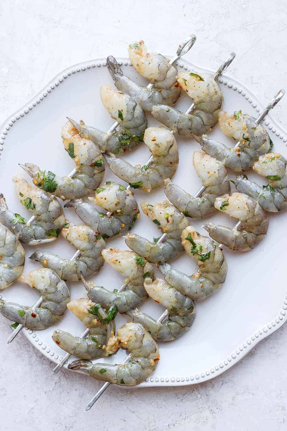 - Remove the shrimp from the marinade and slide 4-5 shrimps onto a skewer. Be sure to skewer the thick part of the shrimp and the tail. Repeat until all shrimp are skewered.