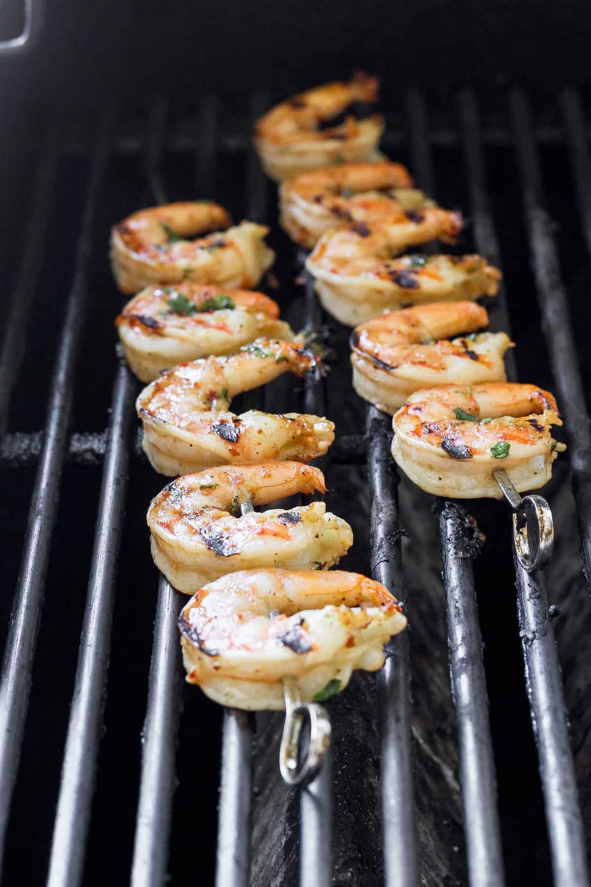 When the grill reaches 400ºF place shrimp skewers on the grill grate over direct heat. Grill for 1-2 minutes on each side. Once the shrimp have turned pink in color and have reached an internal temperature of 145ºF, you know they are done cooking!