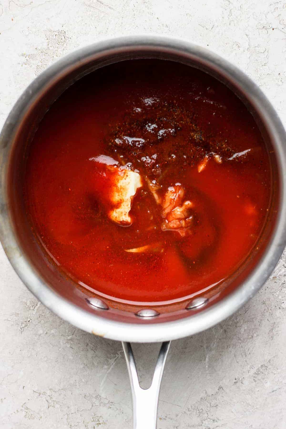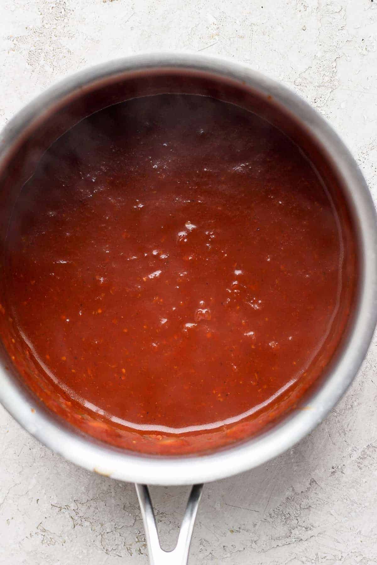 - Place all BBQ sauce ingredients into the pan, mix well, and bring to a boil.