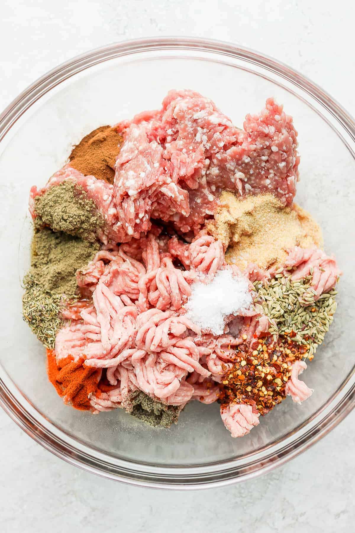- Place all of the ingredients for the pork sausage in a large bowl (except for the olive oil).