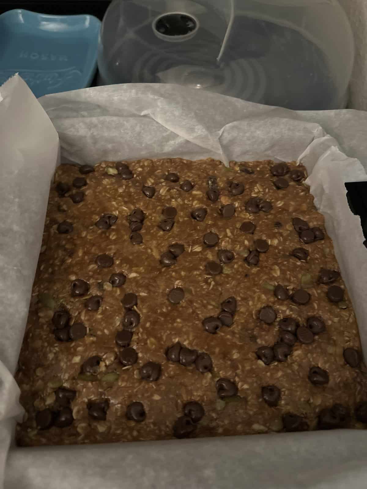 - Transfer dough to pan: transfer the granola bar mixture into your pan. Then place a piece of parchment paper on top (so your hands don’t get dirty) and press them into the pan.