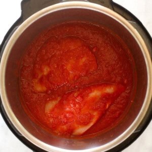 - Turn off the Instant Pot sauté feature and add the crushed tomatoes, buffalo sauce, chicken broth, chili powder, cumin, and garlic powder. Mix well. Submerge the chicken breasts in the sauce and close the Instant Pot.