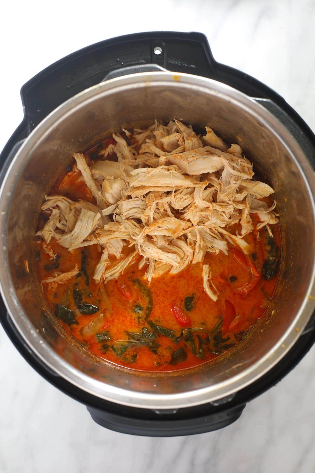 - Step 4: Shred Chicken – When the timer goes off, quick release Instant Pot and remove the chicken breast. Carefully use 2 forks to shred the chicken and then put the chicken back in the Instant Pot along with the sautéed veggies from earlier. Mix.