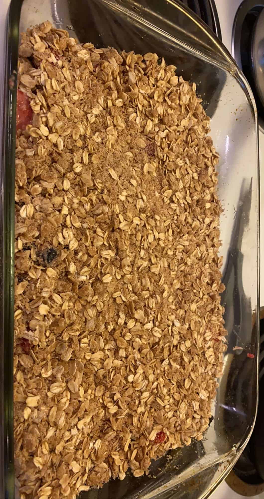 - Transfer the crumble topping on top of the berries, making sure that it’s evenly spread out.