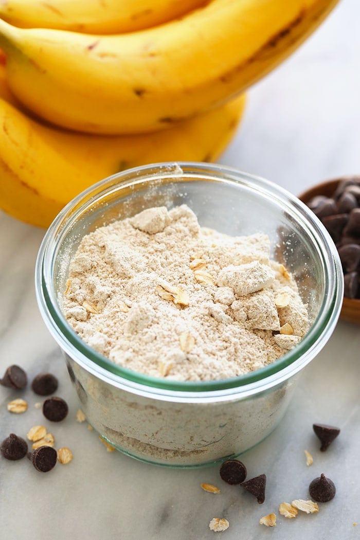 You’ll see that there are 4 ingredients listed above, but you can actually make your own ground oat flour at home by grinding your oats into a flour. This is such an easy trick and believe me, a lot cheaper too!