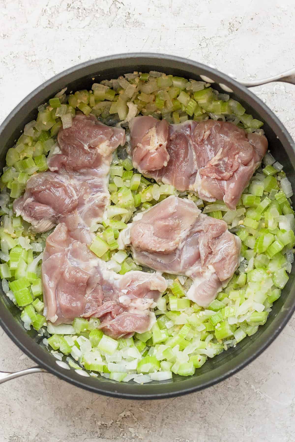 Next, add the chicken thighs (with the thigh side down!) to the Dutch oven and brown the chicken for 1 minute.