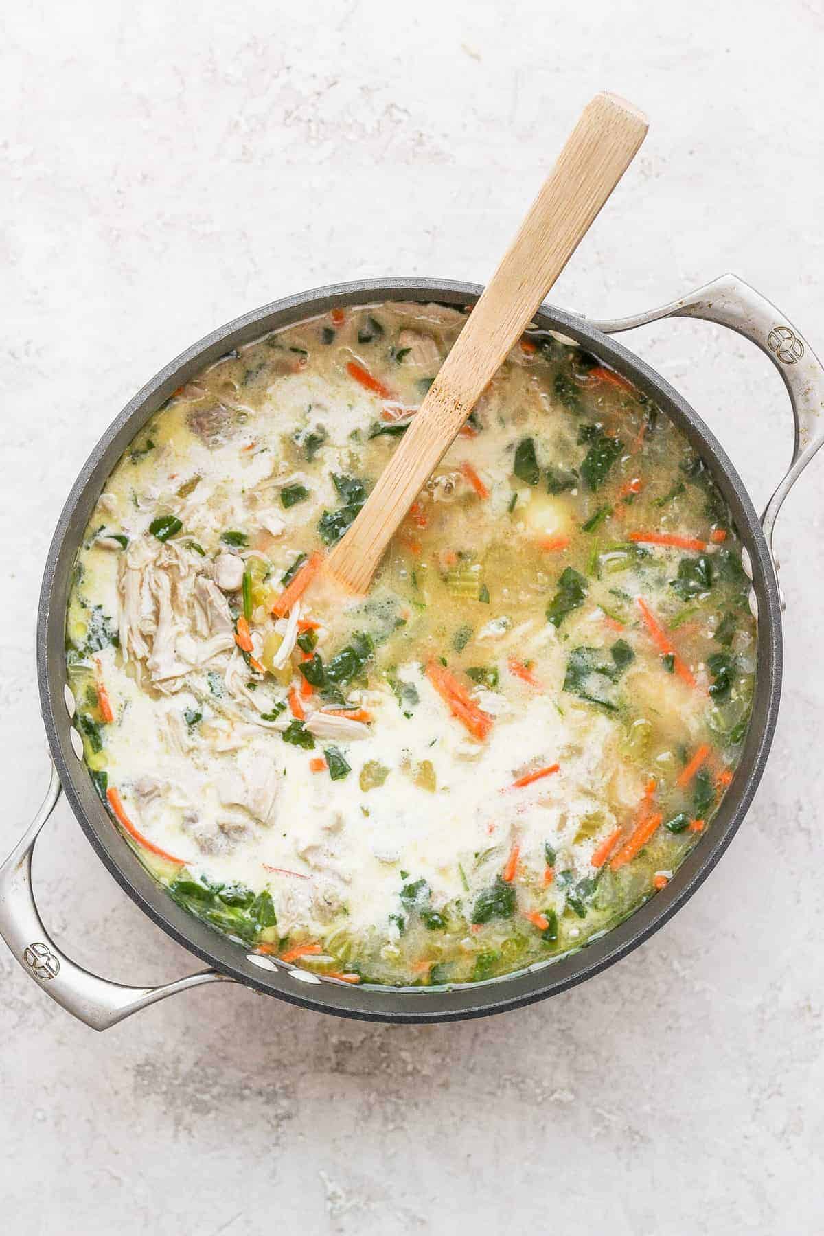 Remove the soup from the heat and slowly add the heavy cream to the pot. Mix until the cream is combined into the soup.