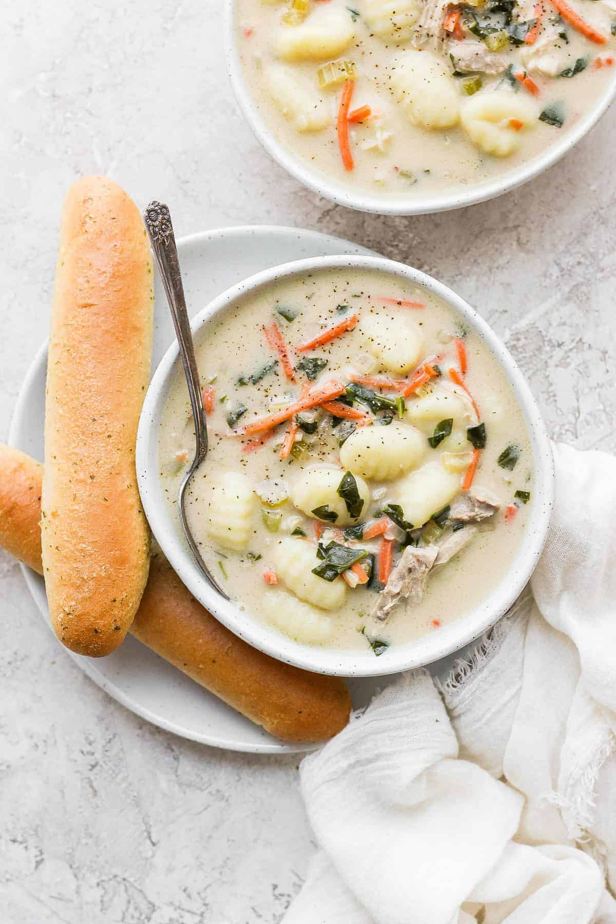 Serve this chicken gnocchi soup with a bread stick just like at Olive Garden. Let’s get into it, shall we?!
