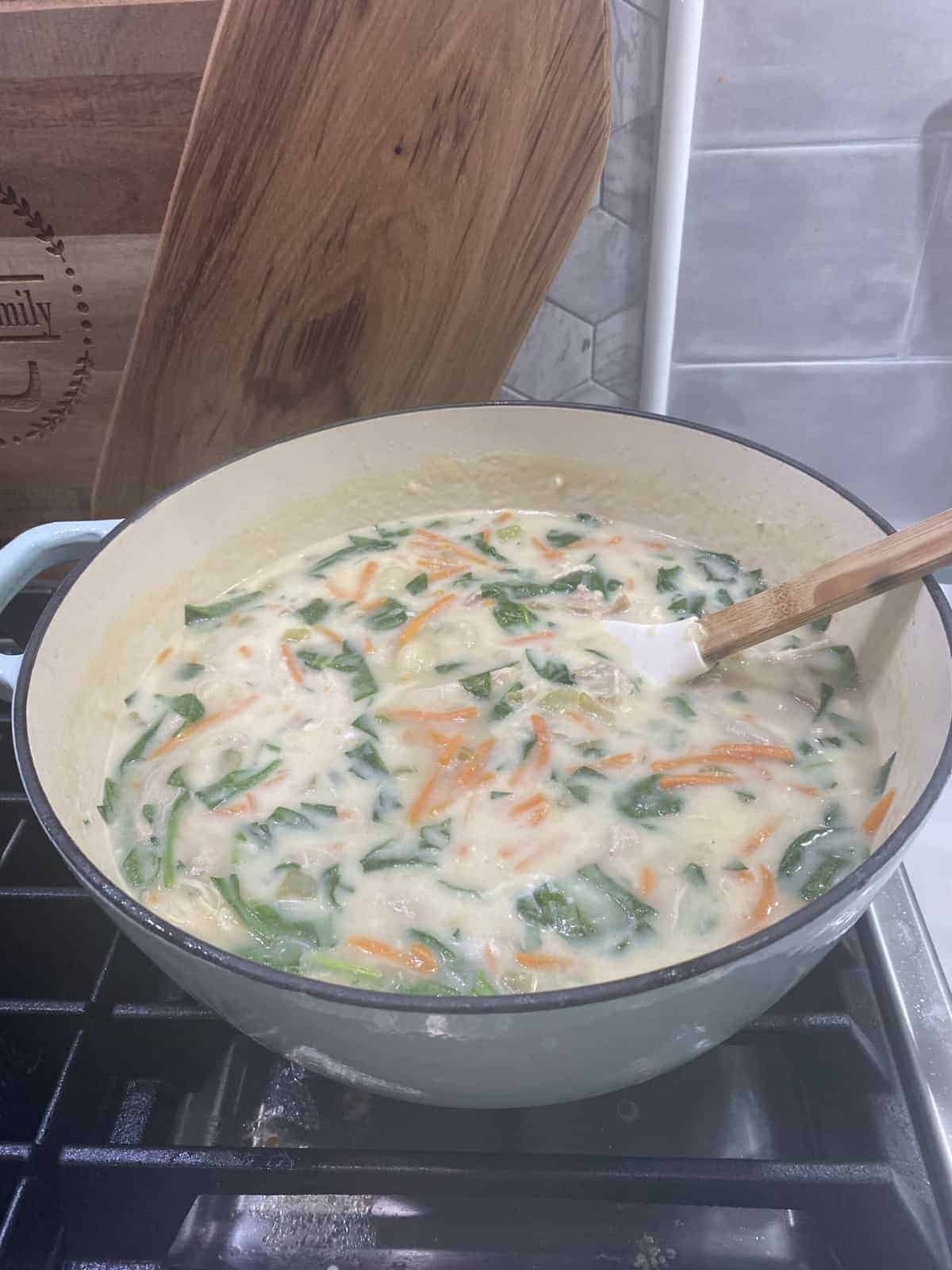 - Add the spinach, carrots, and gnocchi to the pot and turn the heat back to medium/high and let the soup simmer until the gnocchi floats to the top of the soup. Turn heat to low.