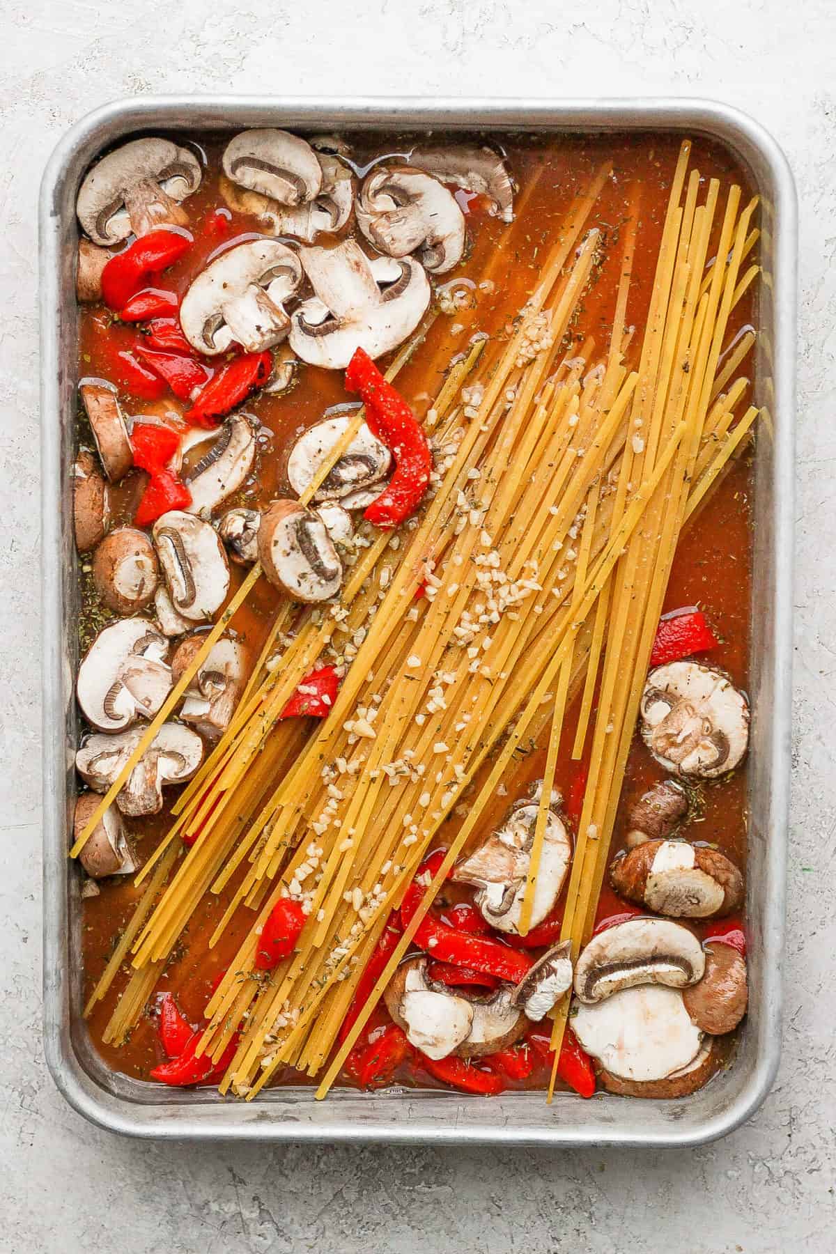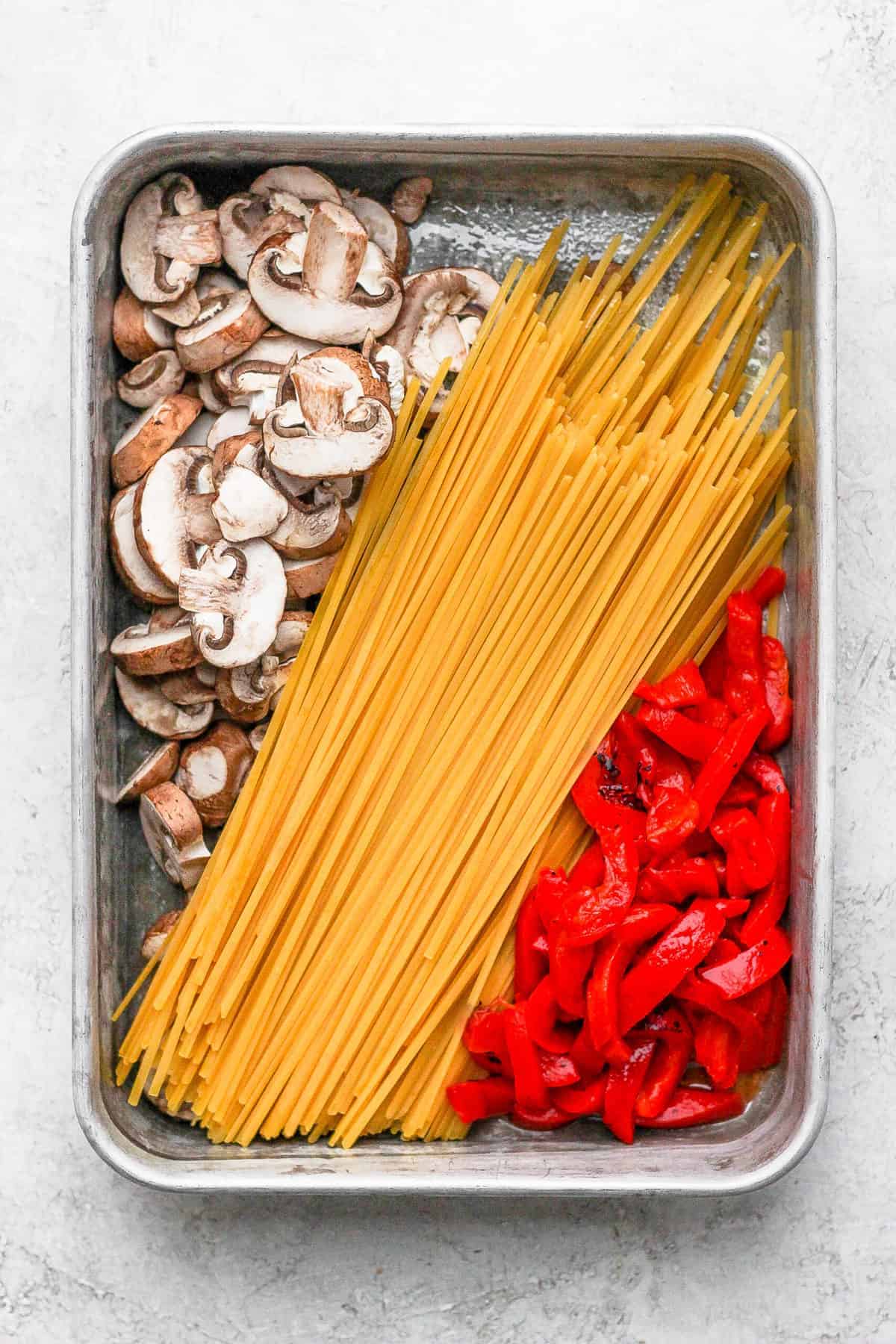 - Place the dried pasta, roasted red peppers, and mushrooms in the baking dish, mix together and set aside.