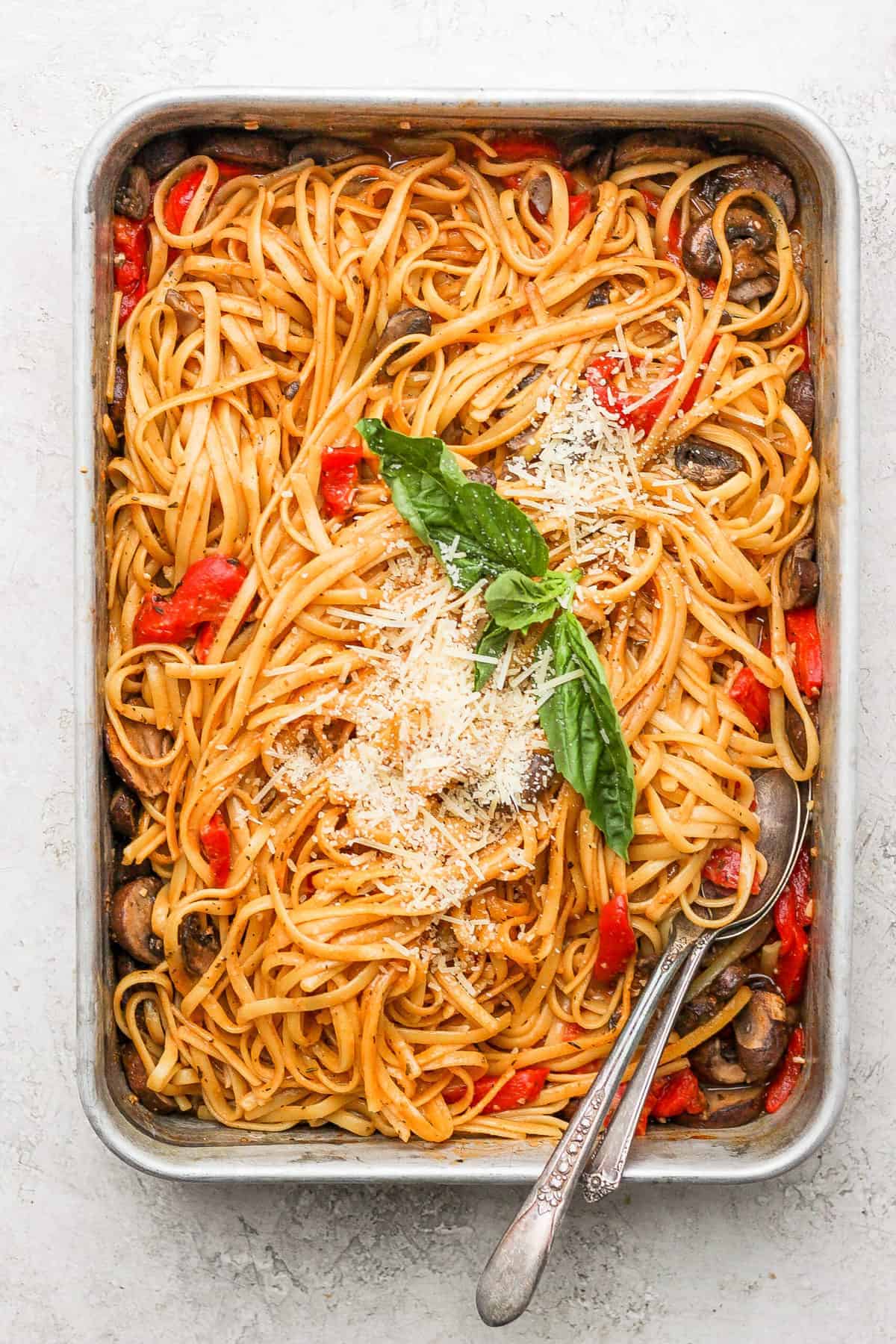 This pasta is perfect for new parents! So easy to put together, and totally hands off if you buy pre-sliced peppers and mushrooms. We used whole wheat linguine and had to bake it a bit longer, and added cherry tomatoes that we needed to use up. Will definitely make it again!