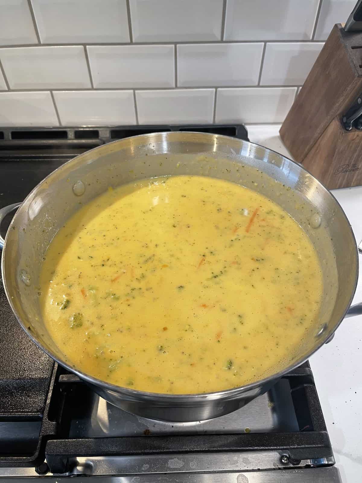 - Remove from the heat and slowly add the shredded cheese to the pot. Consistently stir the cheese into the soup until it is completely incorporated.